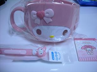 マイメロのコップとボールペン。こういうの好きですから、すぐ使い出しました。